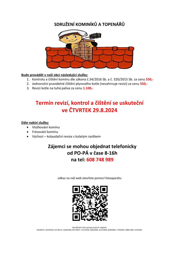 Sdružení kominíků a topenářů bude ve čtvrtek dne 29.8. provádět požadované kontroly a čištění komínů dle zákonu č. 34/2016 Sb. za 550 Kč, čištění plynových kotlů za 550 Kč a revize kotlů na tuhá paliva za 1.100 Kč. Dále nabízí vložkování a frézování komínů.