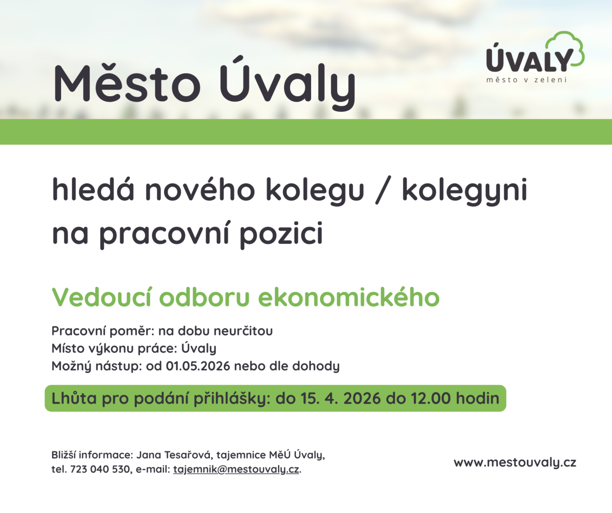 MěÚ Úvaly prodlužuje výběrové řízení na pozici vedoucího ekonomického úseku. Více informací v přiloženém letáku.