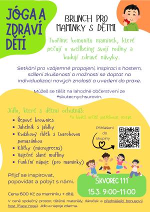 Zveme vás na setkání pro maminky s dětmi, které se uskuteční 15. března 2026 od 9:00 do 11:00 ve Vzdělávacím centru 111 ve Škvorci. Přijďte si užít brunch plný zdravého jídla a inspirace. Těšit se můžete na různé lahodné pokrmy jako řepové brownies, jahelník s jablky a další.