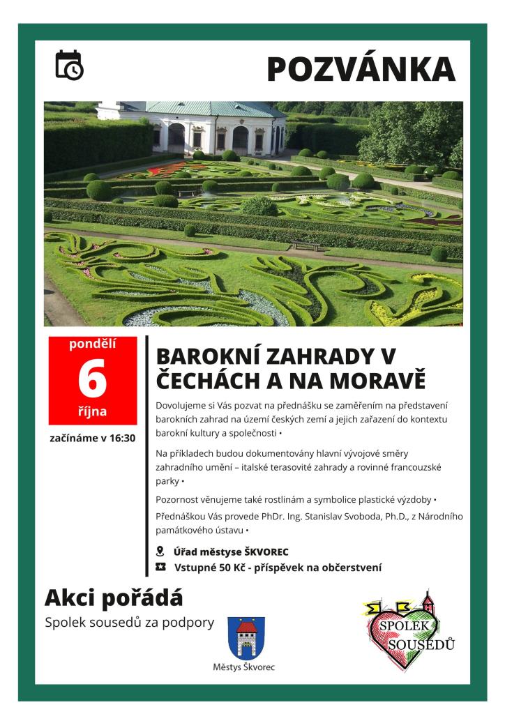 Zveme Vás na přednášku zaměřenou na barokní zahrady v českých zemích. Přednáška se uskuteční 6. 10. 2025 od 16:30 v prostorách úřadu městyse Škvorec. PhDr. Ing. Stanislav Svoboda, Ph.D. z Národního památkového ústavu Vás seznámí s hlavními vývojovými směry zahradního umění, jako jsou italské terasovité zahrady a francouzské parky. Pozornost bude věnována také rostlinám a symbolice plastické výzdoby. Vstupné činí 50 Kč, které je určeno na občerstvení.