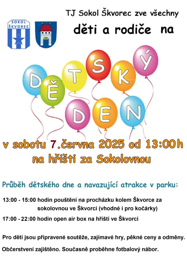 TJ Sokol Škvorec vás srdečně zve na Dětský den, který proběhne v sobotu 7. června 2025. Akce začíná od 13:00 a potrvá až do 22:00. Děti se mohou těšit na soutěže, hry a pěkné ceny. V průběhu dne se také uskuteční fotbalový nábor. Občerstvení je zajištěno. Přijďte se pobavit a užít si zábavu s rodinou!