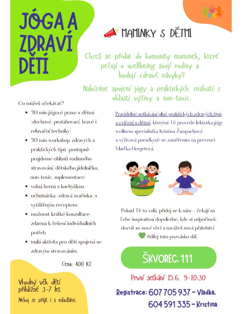 Zveme všechny maminky na inspirativní setkání zaměřené na wellbeing rodiny. Přijďte si vychutnat 30 minut jógové praxe s dětmi pod vedením odbornic na zdraví. Dále se můžete těšit na workshop o zdravém stravování s praktickými tipy a ochutnávkou zdravých svačinek. V rámci akce bude i volná herna s kuchyňkou pro děti a možnost konzultace s odbornicemi. Nezapomeňte se registrovat!