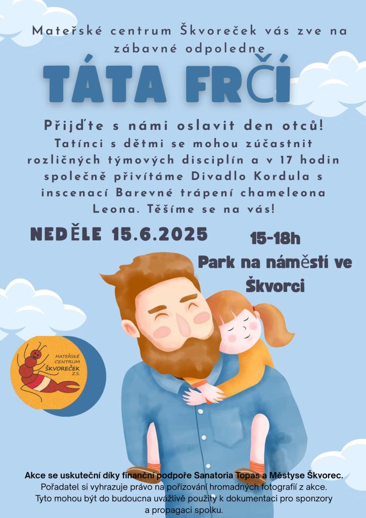 Mateřské centrum Škvoreček srdečně zve všechny rodiny na oslavu Dne otců s programem "TÁTA FRČÍ". V neděli 15. června 2025 od 15 do 18 hodin se v parku na náměstí ve Škvorci uskuteční zábavné odpoledne plné týmových disciplín pro tatínky a děti. V 17 hodin se můžete těšit na představení Divadla Kordula s inscenací "Barevné trápení chameleona Leona". Těšíme se na vaši účast!